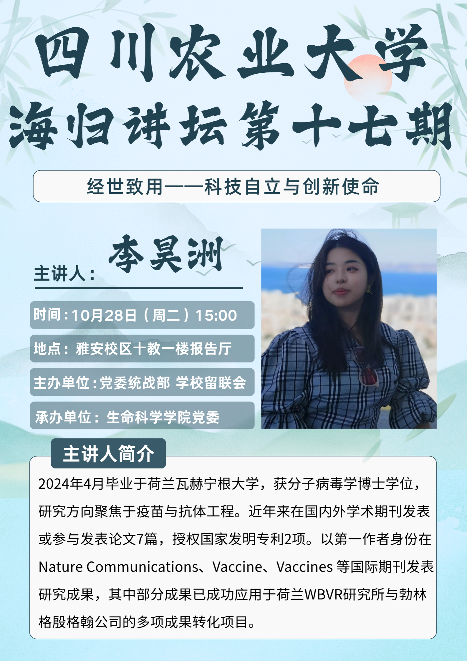 为深入学习贯彻党的二十届三中全会和习近平总书记在全国教育大会上的重要讲话精神,进一步发挥留学归国人员特有的育人功能,学校党委统战部和留学人员联谊会特推出"海归同心·筑梦川农”海归讲坛。通过展现我校教师海外求学载誉而归,报效祖国、服务三农的相关事迹和精神风采,激发青年师生学习成长的动力和兴农报国的使命情怀。